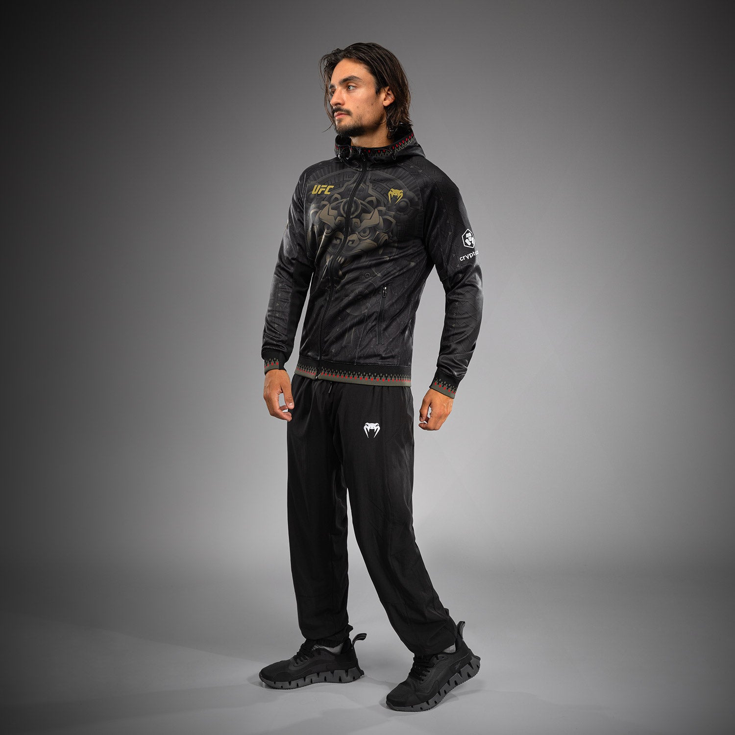 The Men’s Noche UFC 2.0 By Venum Authentic Fight Night Walkout Hoodie features the Aztec god Tezcatlipoca in a jaguar form. Honored as a protector of warriors and a symbol of strength and transformation, Tezcatlipoca reflects the spirit of resilience and the journey toward Mexico’s independence.