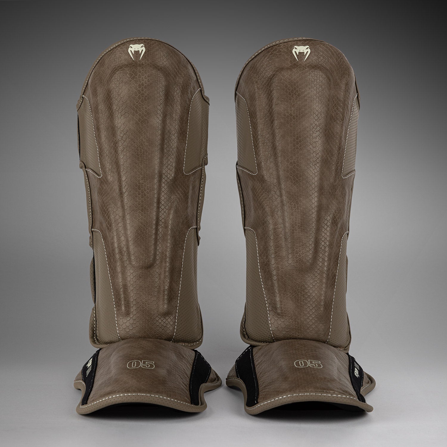 These striking shin guards feature beige stitching along the lines of their anatomical construction for a subtle contrast effect. Meanwhile textured scales spread across the surface - a reminder to strike hard and fast with Venum.