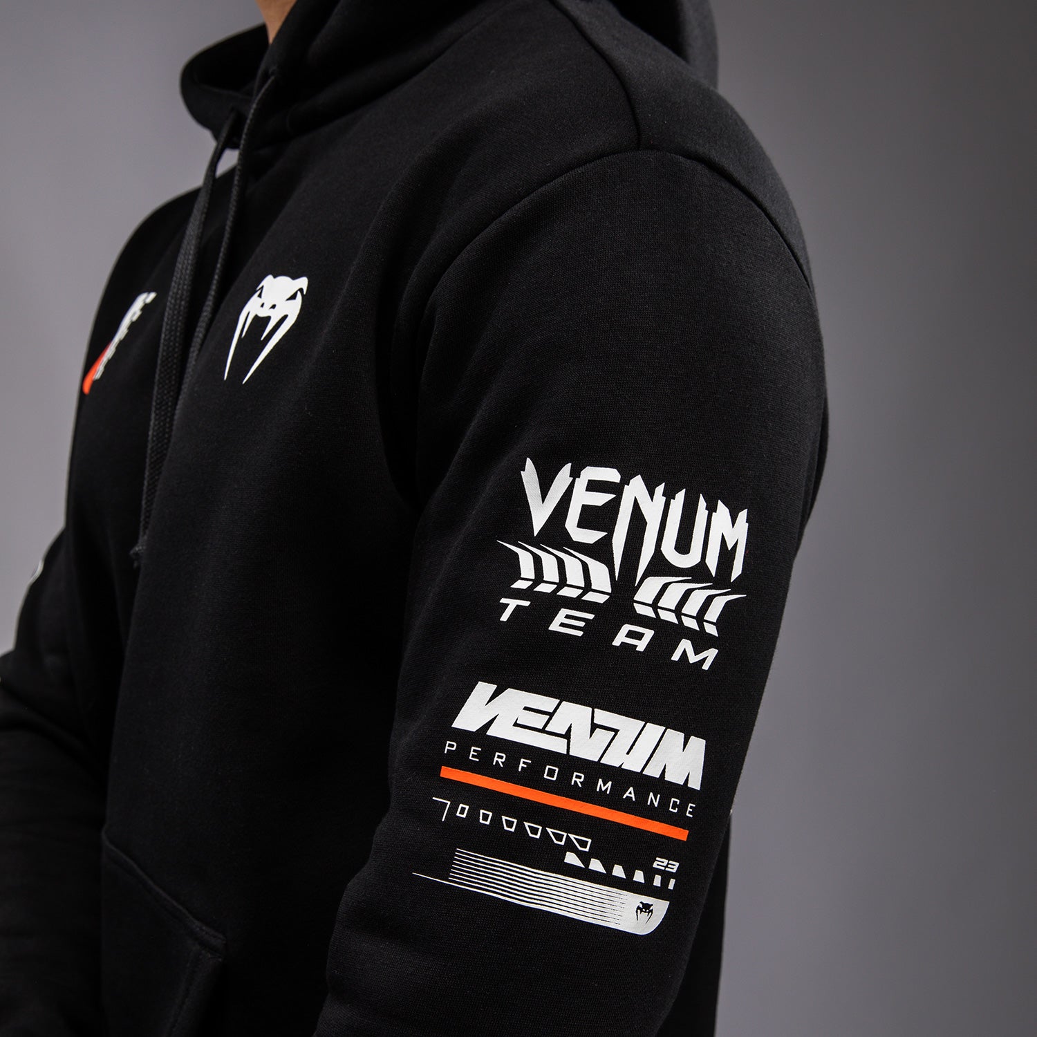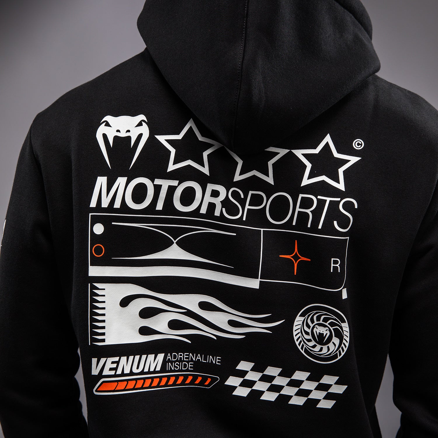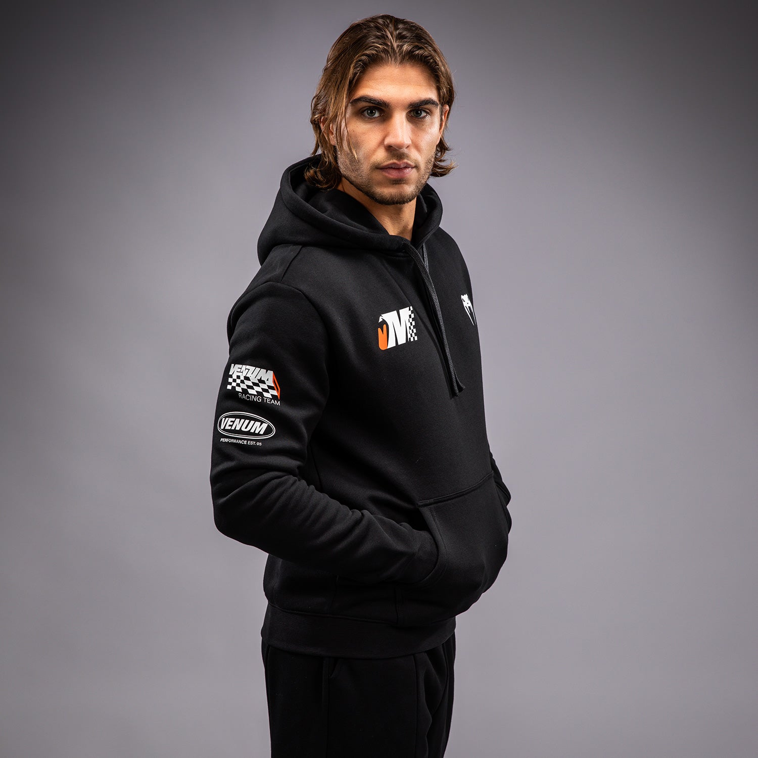The Venum Motorsport Hoodie in Deep Black is a regular fit pullover featuring a kangaroo pocket and drawstring hood. Featuring orange and white printed and embroidered patches inspired by Venum motorsports, this hoodie is track ready!